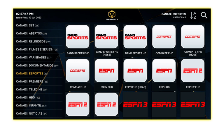 Tenha acesso a todos os canais ESPORTIVOS e assista os jogos do seu time do coração no conforto da sua casa. No TVZIN você conta com todos os canais esportivos e muito +.